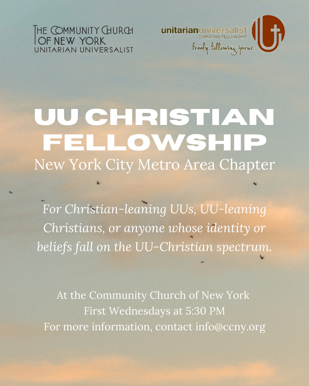 RSVP to pclarke@ccny.org for locationThe UU Christian Fellowship at Community Church is a space for UU Christians to dive deeply into the story of Jesus for grounding and hope amidst the chaos of this historical moment.