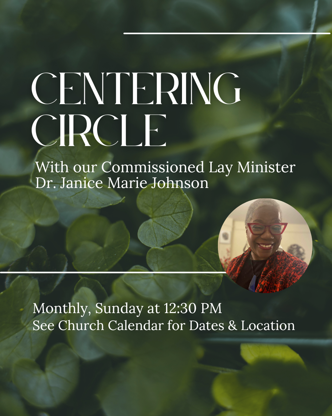 ZoomJoin Dr. Janice Marie Johnson, Commissioned Lay Minister, and members of our community for an evening of community, conversation, and centering.